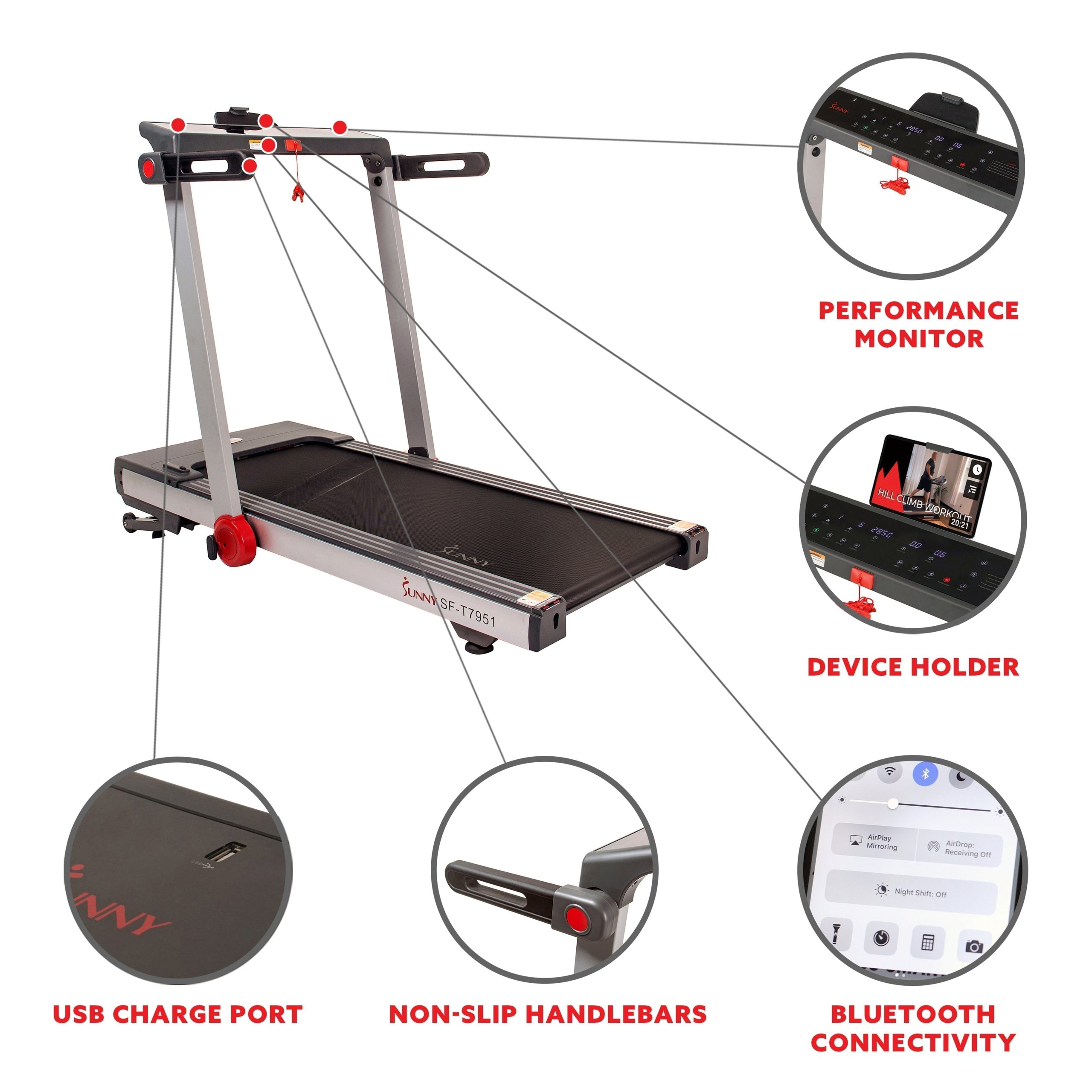 SKU: SF-T7951 Category: Accessories Tags: addfeatures:bluetooth, bis-hidden, bis-paused, comf:emergency stop brake:yes, comf:running surface:50L x 20W in, comf:shock absorption:yes, comf:transportation wheels:yes, conv:foldable:yes, conv:folded product dimensions:14W x 35L x 70H in, conv:product dimensions: 61.5L x 35W x 47.5H in, conv:product weight: 127 lb, conv:ship dimensions:74.2L x 37W x 10.2H in, conv:ship weight:149.8 lb, conv:warranty:3 year structural frame+180 days other parts and components, engr:incline degrees:3°-7°, engr:incline function:Auto Electric, engr:incline levels:15, engr:incline percent:0-15%, engr:max user weight:265 lb, engr:motorized:yes, engr:peak dc hp:2.5 HP, engr:speed range:0.6 - 10MPH, Exercise Machine US, features-bluetooth, Google Shopping, incline-control-motorized, max user weight range:250 lb - 274 lb, None_financing, over-10, price:$800 to $1000, tech:additional connections:Bluetooth+Speakers+USB Charger, tech:bluetooth:yes, tech:built-in programs:15, tech:device holder:yes, tech:digital monitor:Calories+Distance+Incline+Mode+Speed+Time, tech:quick incline button:3%+6%+9%, tech:quick speed button:3+6+9 MPH, up-to-10-mph