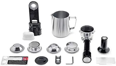 INCLUDED ACCESSORIES: Single & Dual Wall Filter Baskets, Coffee Scoop, Stainless Steel Jug, Cleaning Disc & Tablets, Cleaning Tool, and Water Filter with Holder