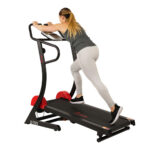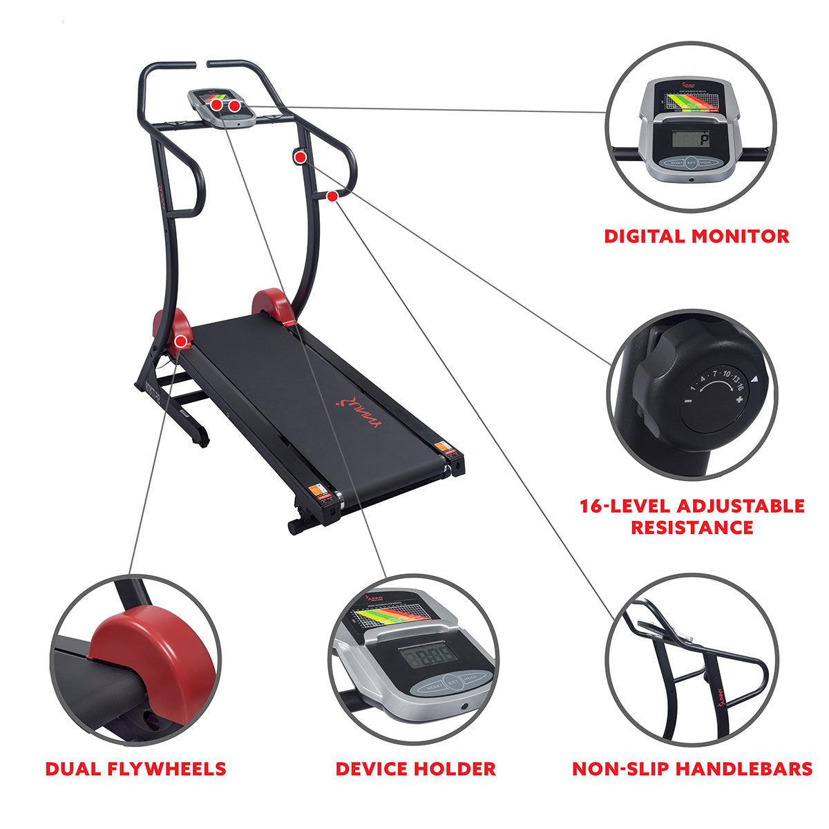 Challenge your cardio routine with the SF-T7878 Magnetic Training Treadmill by Sunny Health & Fitness. With a weight capacity of 300lbs, feel confident when you dash on the running surface (47.5L x 17.5W in). Take advantage of the two, 11-pound flywheels that maintain running belt momentum and adds additional resistance to your exercise. Quickly control workout intensity by using the manual incline adjustor tool, which allows you to switch between three fixed levels of incline. Grab the slip-resistant multi-grip handrails, which you can use as support during dynamic cardio exercises, including high-intensity interval training. Use this cardio machine to practice controlled movements like sled-like training exercises that target muscles in your shoulders and improve your speed. Want even more resistance? Cycle through 16 levels of adjustable magnetic resistance that makes it progressively harder to maintain your running speed.