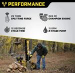 Champion’s towable 25-ton log splitter with its 224cc engine easily powers through the toughest logs. The fast 12-second cycle time and auto-return valve reduce your work time, while the handy log catchers and easy adjustment from horizontal to vertical save your back.