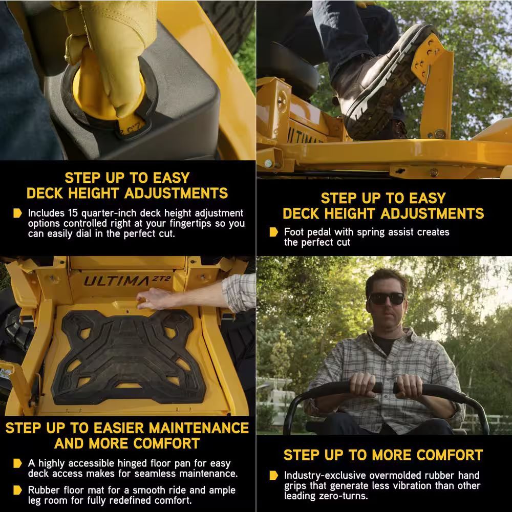 Step up to the ultimate all-around mowing experience with the Ultima Series from Cub Cadet. The ZT1 42 zero-turn mower features a 21.5 HP/726 cc Kawasaki twin-cylinder engine that delivers high-performance power for a consistent cut. The 42 in. stamped deck is engineered for greater airflow to make sure clippings move through cleanly and efficiently for an even cut. A muscular, 2 in. x 2 in. tubular steel frame holds up against the toughest obstacles. You’ll ride in elite comfort with a 20 in. high back seat with a durable advanced polymer seat suspension, adjustable lap bars with ergonomic hand grips, a rubber floor mat and ample leg room. An AGM battery provides reliable starting with a slower discharge so you won’t have to worry about it going dead during the offseason. Ideal for mowing slight rolling hills and several obstacles up to 2 acres. Backed by a strong 3-year/unlimited-hour warranty, limited lifetime warranty on frame and a nationwide network of Cub Cadet dealers for expert service and support, you’ll get the ultimate mowing experience with the Cub Cadet Ultima Series.