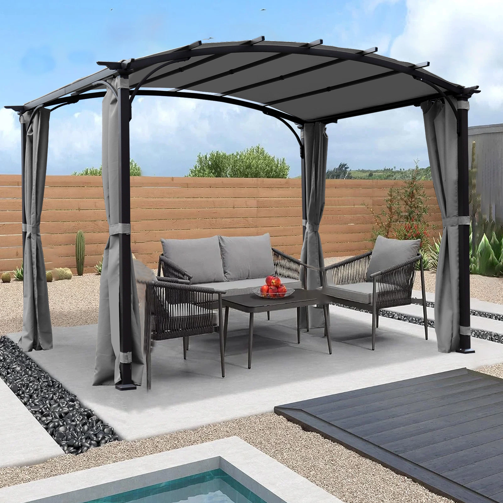 Enhance your outdoor living space with this stylish and functional 9 x 11 ft arched patio pergola gazebo. The waterproof sun shade shelter and durable steel frame provide the perfect spot for all your garden, backyard, and outdoor activities. Enjoy adjustable shading and easy setup with this versatile and elegant gazebo.