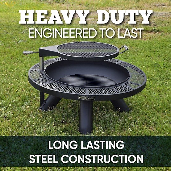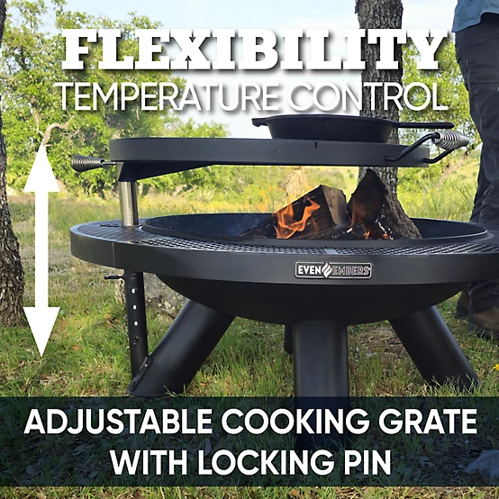 Turn your backyard into the ultimate gathering space with the Even Embers 44-Inch Round Fire Pit with Cooking Grate. Built with heavy-gauge steel construction, this durable and versatile fire pit is perfect for cozy evenings and outdoor cooking. The 24-inch diameter coated steel cooking grate provides an impressive 452 square inches of cooking space, smoothly swiveling 360 degrees for easy access. The adjustable height locking pin ensures precise cooking control, allowing you to achieve the perfect sear on your favorite foods.