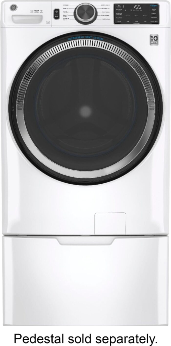 Care for clothes in fewer steps with this GE front-load washer. The UltraFresh vent system with OdorBlock eliminates excess moisture to help prevent odors, ensuring your washer stays fresh and clean, and the Microban antimicrobial technology delivers protection that lives on load after load. This GE front-load washer has built-in Wi-Fi so you can control your laundry from anywhere.