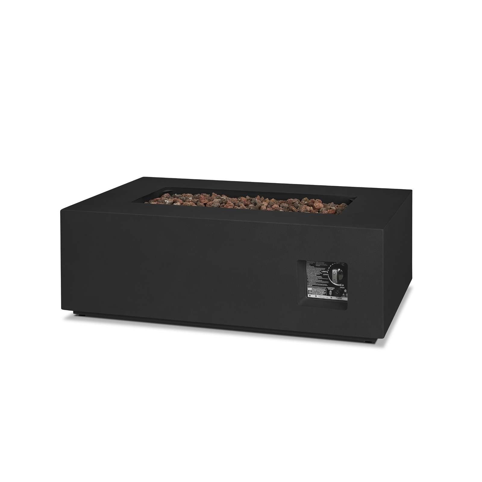 Make a stunning addition to your outdoor space with the clean, contemporary design of the Aegean rectangle gas fire table. Made of durable steel with a lightly textured finish, this outdoor fire table features a reliable push-button ignition and has adjustable flame height. Gas fire pit table with leveling feet, stainless steel burner, burner lid, lava rock, storage cover, propane hose with regulator and natural gas conversion kit are included. Providing 50,000 BTUs of heat, this outdoor propane fire pit can be converted to natural gas by a certified natural gas technician using the conversion kit. When not in use, transform this gas fireplace into a useful outdoor coffee table with the matching burner lid. Complete your patio set with the Aegean outdoor chair, loveseat, sofa and propane tank cover that doubles as a side table. Real Flame® gas fire pits are CSA certified and weather, sun and rust resistant.