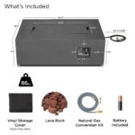 • Includes fire table with leveling feet, 23″ linear stainless steel burner, burner lid, lava rock filler, storage cover, AAA battery, tank seat, touch up paint for mist gray and weathered slate finish, 9’LP hose with regulator and natural gas conversion kit with 10′ NG hose and quick connect socket