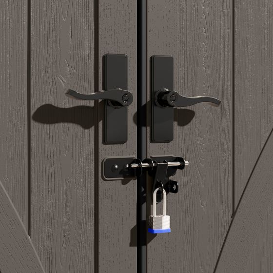 This slim Tremont® 8 ft. x 4 ft. Storage Shed by Suncast® is the perfect solution for storing all your lawn and gardening items when yard space is limited. The compact footprint design fits nicely along a house or garage, yet still has plenty of space for storing long handled tools, ladders, patio umbrellas and gardening supplies. In addition, the included standard corner shelves allow more options for organization. Two skylights along with the large door windows provide natural light. Sturdy double doors allow you to access your items easily and is equipped with pad-lockable metal handles for added security (lock not included). Constructed of metal reinforced, multi-wall resin panels, this sturdy shed is weather resistant and built to last.