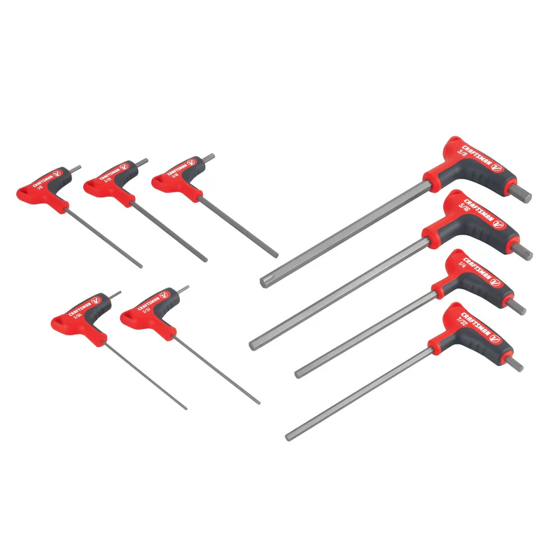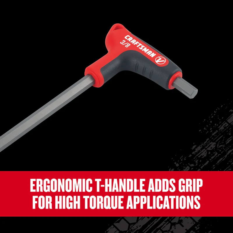 Craftsman V-Series™ tools are designed to professional specifications. With patented X-Tract Technology , removing rounded or rusted fasteners just got easier. The Craftsman V-Series™ 9pc X-Tract Technology SAE T-Handle Set is designed to remove fasteners up to 50% rounded, while also helping to prevent rounding or stripping of new fasteners. The X-Tract Technology grooves in the tip create additional engagement points for gripping and help to release stress on the interior of the fastener as you turn. Each key is also manufactured from premium S2 steel for strength and durability, with an ergonomic, over-molded handle for additional grip in high torque applications. This set includes 5/64″, 3/32″, 1/8″, 5/32″, 3/16″, 7/32″, 1/4″, 5/16″, 3/8″