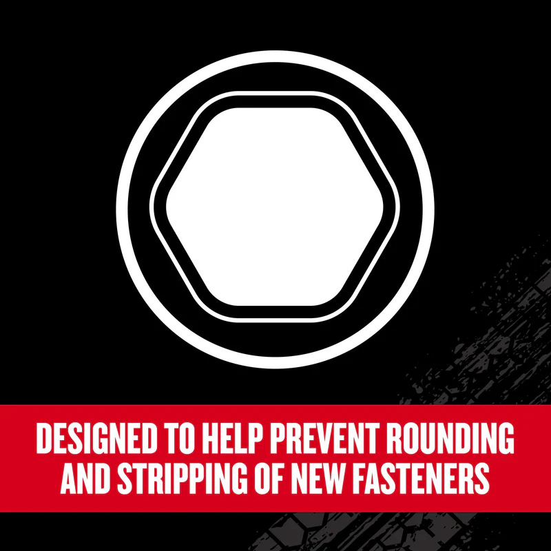 • Rounding prevention – designed to help prevent rounding and stripping of new fasteners